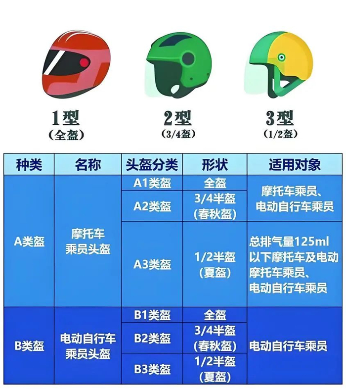 根据适应对象,头盔分为A类盔和B类盔,A类盔为摩托车乘员头盔,适用于摩托车乘员和电动自行车乘员;B类盔为电动自行车乘员头盔,仅适用于最高时速不大于25km/h的电动自行车乘员。摩托车头盔按类型分为全盔、3/4半盔和1/2半盔,适用于不同的乘员。