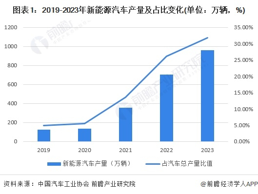 占比方面,新能源汽车产销量在汽车总产销量占比由2019年的不到5%,逐年提升至2023年的30%以上,新能源汽车产销量的增长为汽车行业整体增长情况做出了巨大贡献。