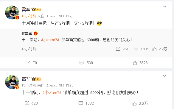 近日,小米集团创始人雷军公布了一个好消息,在刚刚过去的十一假期,小米su7锁单超过6000辆。他还为小米汽车定下了十月冲刺目标:生产2万辆,交付2万辆。