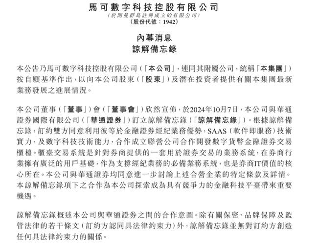 10月7日晚,马可数字科技(01942.HK)正式宣布,与华通证券国际宣布达成战略合作,双方将共同开发证券行业数字柜台SaaS系统。这一合作标志着马可数字科技在券商服务行业中的进一步拓展,将为整个金融科技行业注入新的发展推动力。