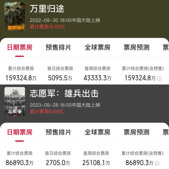 今年国庆档,《志愿军:存亡之战》虽领跑,预测内地总票房目前暂为15亿,但仍旧不可否认,主旋律大片的黄金周期已经过去,观众不再自发地、天然地对此类型保持兴趣与宽容。它们必须找到与观众紧密连接的痛点、爽点与话题等营销方向,才有可能继续拉动票房上涨。