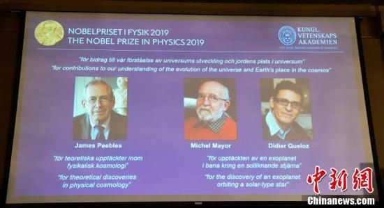 资料图:瑞典皇家科学院将2019年诺贝尔物理学奖一半授予詹姆斯·皮布尔斯,以表彰其对宇宙演化过程的理论发现,另一半授予米歇尔·马约尔和迪迪埃·奎洛兹,表彰他们对地球在宇宙中的地位的发现。