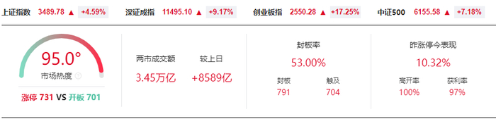 1、创业板指暴涨超17% 沪指涨4.59%逼近3500点 两市超5000股飘红 成交3.45万亿续创历史新高