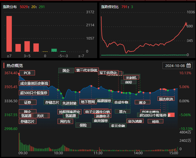 A股连续大涨后出现分歧,今日指数高开回落,沪指一度涨超10%站上3600点,创业板指一度涨超18%,尾盘再度拉升。截至收盘,沪指涨4.59%逼近3500点,深证成指涨9.17%,创业板指涨17.25%。两市个股普涨,超5000股上涨;两市全天成交3.45万亿元续创历史新高,较上一日放量8589亿元,内资主力资金净流出2148亿元。盘面上,市场情绪持续火热,科技股强势领涨。科创板次新股全天涨幅居前,C合合涨超42%,益诺思、龙图光罩等20cm涨停;半导体板块表现活跃,存储芯片、国家大基金持股、光刻机等方向涨幅居前,华岭股份、凯德石英30cm涨停,国科微、国民技术等多股20cm涨停;信创、鸿蒙板块再度爆发,个股掀起涨停潮,宇信科技、天玑科技、荣科科技等20cm涨停;华为欧拉、昇腾、鲲鹏等华为产业链亦集体大涨。牛市旗手券商股集体涨停,互联网金融概念再度领跑大金融板块,华信永道、艾融软件等30cm涨停;AI手机概念引爆消费电子板块,中科创达、诚迈科技等20cm涨停;BC电池、光伏设备等新能源赛道股集体走强,罗博特科、晶盛机电等多股20cm涨停;商业航天概念午后异动,安达维尔20cm涨停;军工电子、机器视觉、量子科技、OLED、光模块、无人驾驶、环保等板块纷纷大涨,房地产、黄金、猪肉等板块涨幅相对较小。消息面上,1、政治局会议要求努力提振资本市场、大力引导中长期资金入市;中央金融办、证监会联合印发《关于推动中长期资金入市的指导意见》;2、8000亿大礼包打响第一枪,首单股票回购增持专项再贷款落地佰仁医疗;3、上交所延长接受指定交易申报指令时间;4、国庆楼市火了!广州日均成交翻倍、上海二手房量价齐升、深圳又见“抢房客”;5、各路资金跑步进场,国庆假期各大券商开户数创历史新高,海外投资者疯抢中国资产;6、据报道,金融管理部门已进行窗口指导:银行信贷资金严禁违规进入股市。