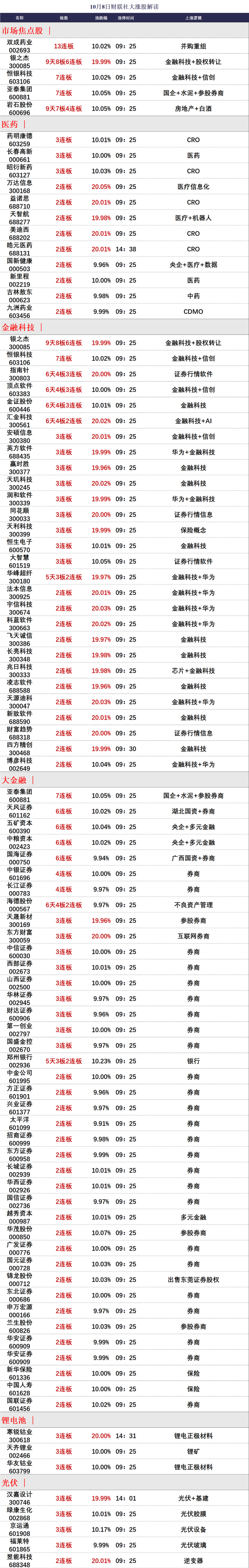 消息面上,1、政治局会议要求努力提振资本市场、大力引导中长期资金入市;中央金融办、证监会联合印发《关于推动中长期资金入市的指导意见》;2、8000亿大礼包打响第一枪,首单股票回购增持专项再贷款落地佰仁医疗;3、上交所延长接受指定交易申报指令时间;4、国庆楼市火了!广州日均成交翻倍、上海二手房量价齐升、深圳又见“抢房客”;5、各路资金跑步进场,国庆假期各大券商开户数创历史新高,海外投资者疯抢中国资产;6、据报道,金融管理部门已进行窗口指导:银行信贷资金严禁违规进入股市。