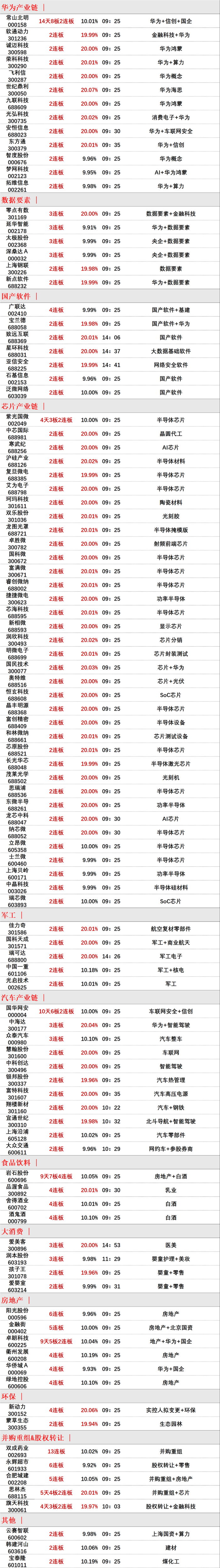 盘面上,市场情绪持续火热,科技股强势领涨。科创板次新股全天涨幅居前,C合合涨超42%,益诺思、龙图光罩等20cm涨停;半导体板块表现活跃,存储芯片、国家大基金持股、光刻机等方向涨幅居前,华岭股份、凯德石英30cm涨停,国科微、国民技术等多股20cm涨停;信创、鸿蒙板块再度爆发,个股掀起涨停潮,宇信科技、天玑科技、荣科科技等20cm涨停;华为欧拉、昇腾、鲲鹏等华为产业链亦集体大涨。牛市旗手券商股集体涨停,互联网金融概念再度领跑大金融板块,华信永道、艾融软件等30cm涨停;AI手机概念引爆消费电子板块,中科创达、诚迈科技等20cm涨停;BC电池、光伏设备等新能源赛道股集体走强,罗博特科、晶盛机电等多股20cm涨停;商业航天概念午后异动,安达维尔20cm涨停;军工电子、机器视觉、量子科技、OLED、光模块、无人驾驶、环保等板块纷纷大涨,房地产、黄金、猪肉等板块涨幅相对较小。