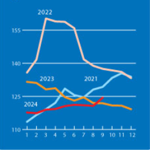 本月植物油价格指数持续上行势头主要由棕榈油、大豆油、葵花籽油和菜籽油全球报价上涨推动。国际棕榈油价格9月份连续第四个月上涨,主要原因是对低于预期的产量的担忧,同时恰逢东南亚主要生产国的预期季节性产量下降。与此同时,世界大豆油报价回升,主要原因是美国低于预期的榨油量。至于葵花籽和菜籽油,9月份价格略微回升的原因是由于2024/25年度两种油籽产量下降,导致供应前景趋紧。