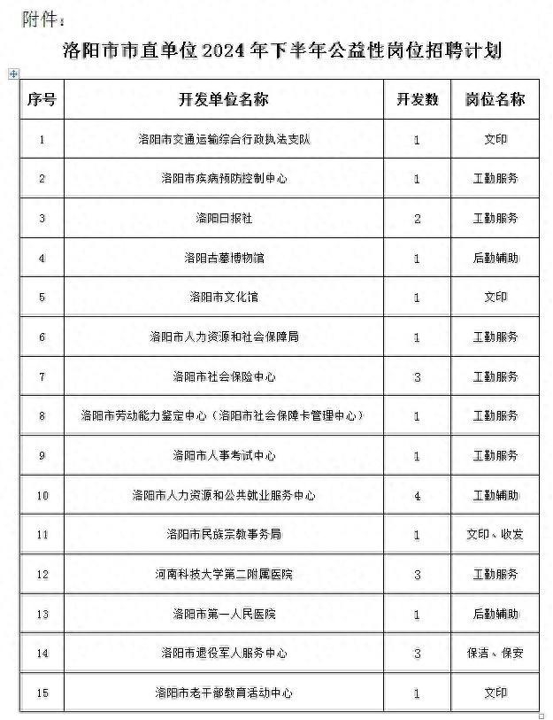 洛报融媒记者从洛阳市人力资源和社会保障局获悉,2024年下半年洛阳市市直单位公益性岗位招聘会将于10月12日在洛阳市体育中心广场举行。