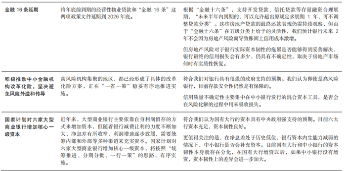 由于各项政策的出台,银行报表上积累的房地产风险和地方隐债风险会以相对缓慢的方式逐步化解或出清,对于披露口径数据的影响可控,但银行实际资本韧性的最终恢复和加强仍需要较长的时间,并且具有不确定性,取决于房地产市场何时才能真正恢复,以及城投的偿债能力何时才能真正改善。对于表内已积累大量坏账的高风险中小银行而言,在目前的净息差环境下,通过资本内生能力修复资本韧性已无可能,其资本韧性的改善主要取决于政府救助安排。