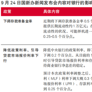 国务院新闻办公室于9月24日上午9时举行新闻发布会,中国人民银行行长潘功胜、国家金融监督管理总局局长李云泽、中国证券监督管理委员会主席吴清介绍了金融支持经济高质量发展的有关情况。会上宣布了多项与商业银行未来财务表现相关的重大政策,总体来看符合我们之前的预期,对银行业信用质量无重大影响。