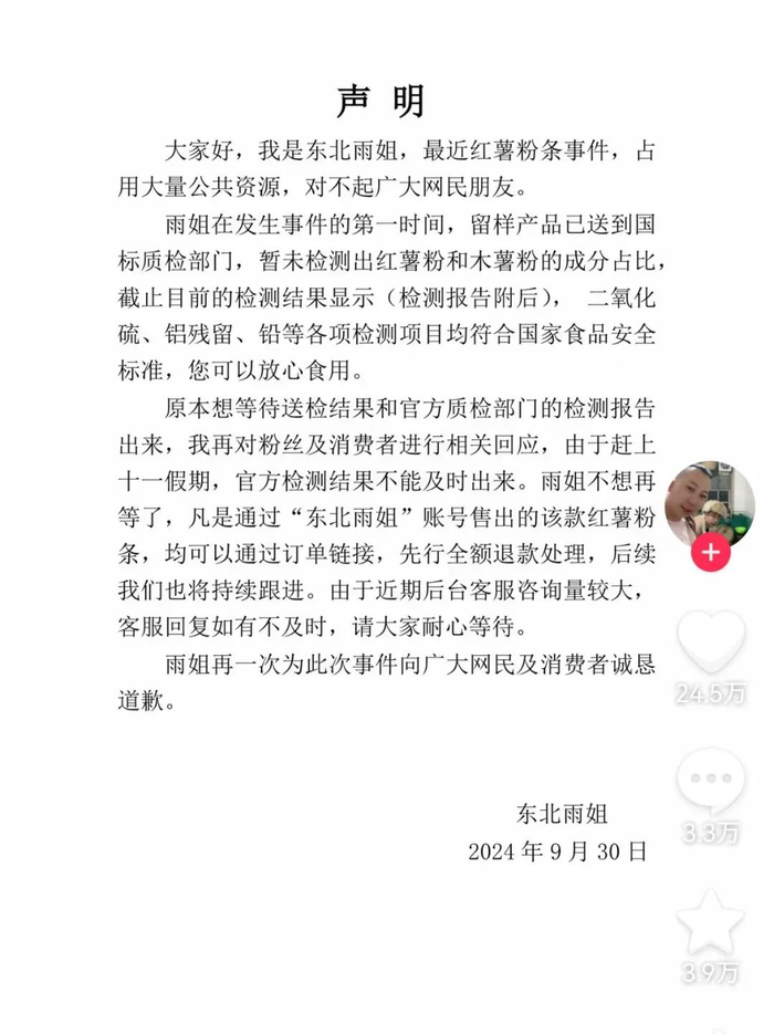 声明还提到,由于赶上十一假期,官方检测结果不能及时出来。凡是通过“东北雨姐”账号售出的该款红薯粉条,均可以通过订单链接,先行全额退款处理。
