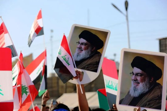 2024年10月4日,在伊拉克巴格达,人们聚集在一起哀悼真主党领导人纳斯鲁拉的死亡,并表达对黎巴嫩和巴勒斯坦人民的声援。(新华社发)