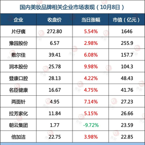 那么,在经过节前普涨以及国庆假期的休整蓄力,当前国内已上市化妆品企业又有着怎样的市场表现呢?