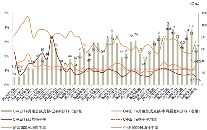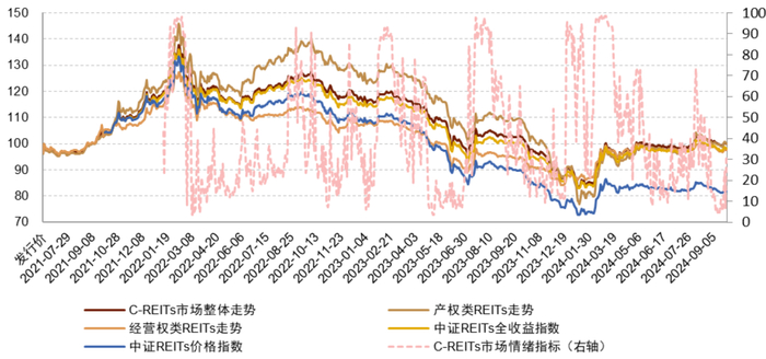 注:1)为了方便对比,我们对中证REITs价格指数及中证REITs全收益指数进行起始日期标准化调整;2)数据截至2024年9月30日;3)C-REITs市场情绪指标根据我们2023年3月24日发布的《公募REITs市场情绪指标初探》中描述的模型计算,并剔除了所有项目上市首日的换手数据