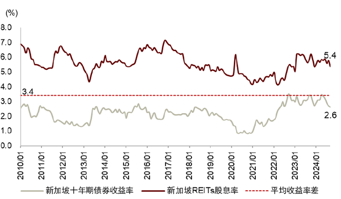 图表29:新加坡REITs股息率与新加坡政府十年期债券收益率对比