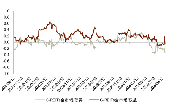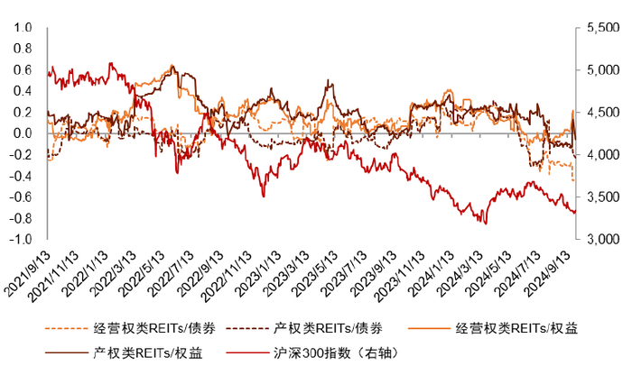 注:1)REITs与债券及权益的关系分别采用中债综合全价指数、沪深300指数计算;2)数据截至2024年9月30日