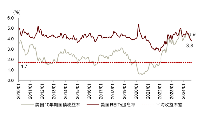 图表23:美国REITs股息率与美国十年期国债收益率对比