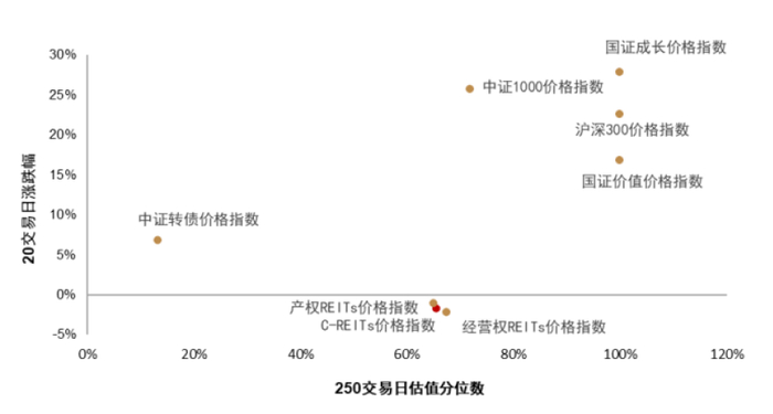 注:1)数据截至2024年9月30日;2)C-REITs估值为市值加权P/NAV,股指估值为P/E(TTM),可转债估值为百元溢价率
