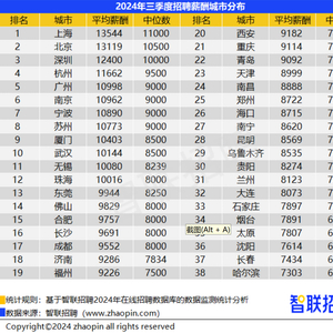 2024年第三季度,智联招聘继续发布《中国企业招聘薪酬报告》,展示国内38个核心城市企业的招聘薪酬水平。报告显示:上海、北京和深圳的招聘薪酬排名领先,平均招聘月薪超过1.2万元,薪酬中位数也过万。职业方面,人工智能工程师仍居于榜首,平均招聘月薪为21930元。