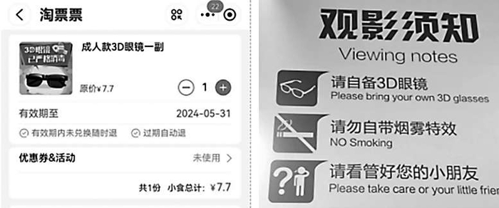 图二:3D眼镜购买记录及影院“自备3D眼镜”提示。