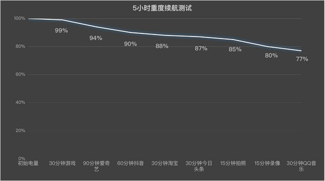 那么电池容量变大了,实际表现又如何呢?我们也对这块电池也进行了相关的续航测试,采用中关村在线5小时重度续航测试模型,在24℃室温环境下,连接办公室Wi-Fi,关闭蓝牙、GPS,屏幕亮度、音量均设为50%,结果如下: