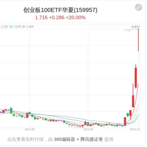 10月8日,市场全天大幅高开回落后再度走高,创业板指续创历史单日最大涨幅。截至收盘,沪指涨4.59%,深成指涨9.17%,创业板指涨17.25%,创业板成长ETF(159967)、创业板100ETF华夏(159957)、科创100ETF华夏(588800)等一批创业板和科创板类ETF更是20CM涨停。