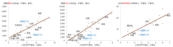 我们以横向和纵向两个角度梳理中国在民生“软基建”方面的空间。所谓横向是指与部分发达国家以及人均收入水平与中国接近的发展中国家现状对比;纵向我们选择美国和韩国成为中等发达国家时期的情况作为参考。若以2015年美元计价,按照世界银行的估算,我国2023年人均GDP约为1.2万美元左右,十四五规划提出“到2035年人均GDP达到中等发达国家水平”,若以2.5万美元左右作为中等发达国家人均GDP的“门槛”(2015年美元计价),那么美国、韩国人均GDP在2.5万美元时(美国为1969年,韩国为2010年)的财政民生支出水平也许可为中国“赶超”提供参考(人均GDP 1万美元到2.5万美元也是我们前面所谓的瓦格纳加速期)。美国非传统意义上的高福利国家,其社会福利体系建设比较注重发挥市场作用;韩国与中国文化相近,人均收入自1.2万美元跃升至2.5万美元(以2015年美元计价)用了16年。下文中所有使用货币计量的指标对比均经过通胀和购买力平价调整。