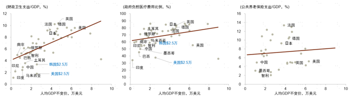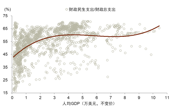 注:样本为Penn World Table和IMF GFS数据库包含的全球各个经济体,时间跨度为1972年至今,人均GDP以2015年美元计价。民生支出为IMF GFS数据库跨国可比口径,主要包括教育、医疗卫生、社会保障和福利方面的财政支出