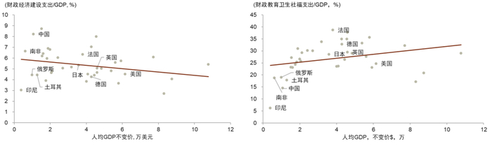 图表5:不同经济体经济建设财政支出与GDP之比(左图)、不同经济体民生财政支出与GDP之比(右图)