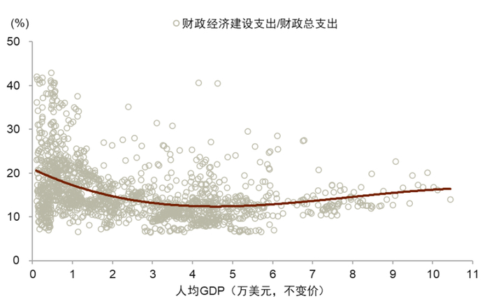 注:样本为Penn World Table和IMF GFS数据库包含的全球各个经济体,时间跨度为1972年至今,人均GDP以2015年美元计价。经济建设支出为IMF GFS数据库跨国可比口径,主要包括农林水利、交通通讯、能源、工业等方面的财政支出