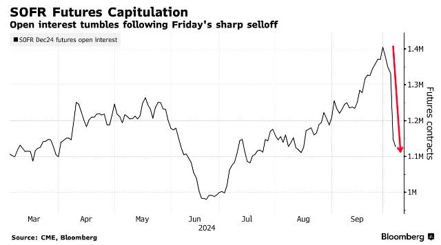数据显示,自就业报告公布以来,SOFR期货的未平仓合约(即期货市场交易员的持仓数量)急剧下降。根据芝商所周二公布的数据,在2024年12月的合约中,两天的持仓量已减少了约22.3万份合约,其规模相当于每变化一个基点的风险权重约为560万美元。在此期间,该合约遭遇大幅抛售,表明随着交易商对美联储今年的政策路径进行重新定价,看涨押注被抹平。