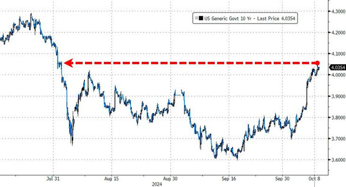 财联社10月9日讯(编辑 潇湘)随着素有“全球资产定价之锚”的10年期美债收益率,本周重新来到了4%关口上方,越来越多的交易员目前正开始担忧美国国债市场将会进一步回吐年内早些时候的涨幅,因为他们预计美联储在年底前或将会以更为缓慢的步伐降息。
