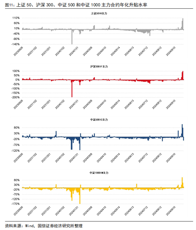 近一年以来上证50股指期货主力合约年化升水率中位数为0.47%, 近一年以来沪深300股指期货主力合约年化升水率中位数为1.37%,近一年以来中证500股指期货主力合约年化升水率中位数为6.22%,近一年以来中证1000股指期货主力合约年化升水率中位数为11.20%,20241008当日上证50股指期货主力合约年化贴水率为4.75%,处于近一年来27%分位点,当日沪深300股指期货主力合约年化升水率为3.75%,处于近一年来80%分位点;具有相对较低的建仓成本,当日中证500股指期货主力合约年化贴水率为29.13%,处于近一年来4%分位点;当日中证1000股指期货主力合约年化升水率为8.98%,处于近一年来96%分位点。具有相对较低的建仓成本,近一年上证50、沪深300、中证500和中证1000主力合约年化升贴水率如下图所示。
