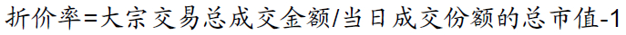 大宗交易是指达到规定的最低限额的证券单笔买卖申报,买卖双方经过协议达成一致并经交易所确定成交的证券交易。大宗交易的成交价如果低于市场价格,就产生了折价,折价的高低一定程度上能反映大资金的投资偏好和情绪。我们统计每日大宗交易的折价率,计算方式为: