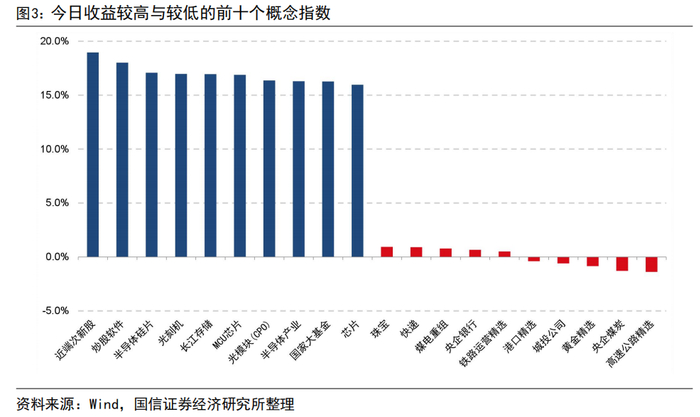 今日近端次新股、炒股软件、半导体硅片、光刻机、长江存储等概念表现较好,收益分别为18.96%、18.01%、17.07%、16.97%、16.95%,高速公路精选、央企煤炭、黄金精选、城投公司、港口精选等概念表现较差,收益分别为-1.38%、-1.29%、-0.85%、-0.60%、-0.39%,今日收益较高与较低的前十个概念指数表现如下图所示。