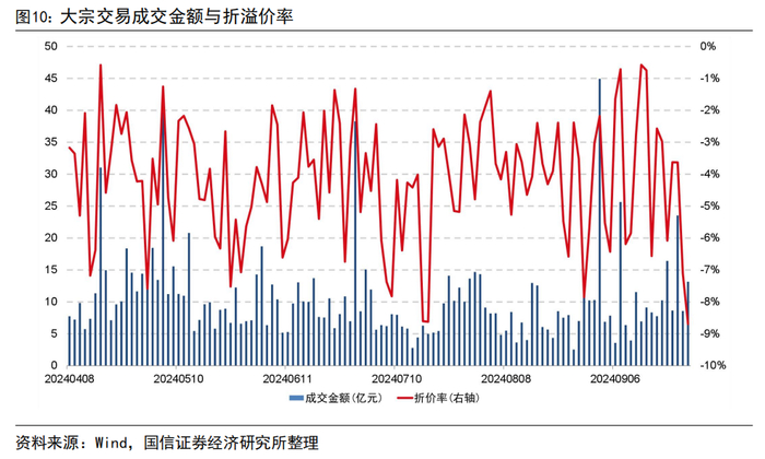 近半年以来大宗交易日均成交金额达到10亿元,20240930当日成交金额为13亿元,近半年以来平均折价率4.16%,20240930当日折价率为8.69%,创近半年来新低,近半年大宗交易成交金额与折价率如下图所示。