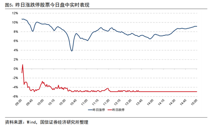 我们统计上市满3个月以上且昨日收盘涨停或跌停的股票在今日盘中的实时表现。昨日涨停股票今日收盘收益为9.17%,昨日跌停股票今日收盘收益为-4.95%。昨日涨跌停股票今日盘中实时表现如下图所示。