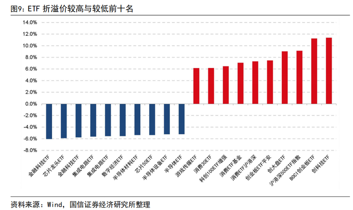ETF是一种在交易所上市交易的、基金份额可变的开放式基金,其可在场外进行申购赎回,也可以在场内交易。其在场内交易的价格与场外价格的差距在一定程度上反映了投资者的情绪。这里我们统计日成交额超过100万的境内交易股票型ETF的折溢价情况。20240930当日溢价较多的是创科技ETF,溢价11.38%,折价较多的是金融科技ETF,折价6.05%,折溢价较高与较低的前十名ETF如下图所示。