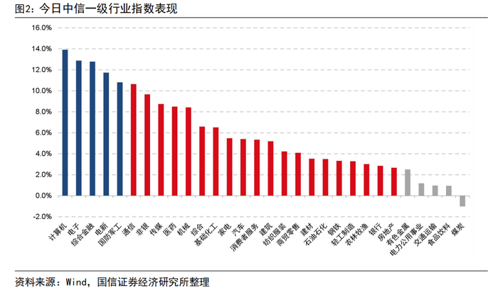 今日计算机、电子、综合金融、电新、国防军工行业表现较好,收益分别为13.91%、12.88%、12.78%、11.73%、10.81%,煤炭、食品饮料、交通运输、电力公用事业、有色金属行业表现较差,收益分别为-1.01%、0.95%、0.97%、1.19%、2.50%,中信一级行业指数今日表现如下图所示。
