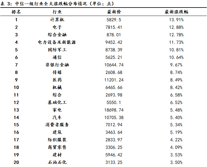 周二A股市场高开低走、震荡上涨,早盘股指高开后震荡回落,盘中股指在3372点附近获得支撑,午后股指维持震荡,尾盘企稳回升,盘中半导体、软件开发、电池、互联网服务以及证券等行业表现较好;旅游酒店、航空机场、煤炭以及房地产等行业表现较弱,沪指全天基本呈现震荡上扬的运行特征。当前上证综指创业板指数的平均市盈率分别为14.24倍、34.99倍,处于近三年中位数平均水平,适合中长期布局。两市周二成交金额34851亿元,处于近三年日均成交量中位数区域上方。新国九条发布,推动市场走向成熟,提振市场长期信心。中央政治局会议释放重磅信号,后续推出一系列财政措施和其他支持性政策预期显著增强。央行、金融监管总局、证监会同时推出多项重磅政策,经济有望企稳回升。美国非农就业数据超预期,经济仍具一定韧性,11月降息25个基点概率增强。随着国内宏观调控、促增长政策持续落地推进,未来股指总体预计将保持震荡上行格局,同时仍需密切关注政策面、资金面以及外部因素的变化情况。我们建议投资者短线关注证券、保险、芯片、医药、非银金融、软件开发以及新能源等行业的投资机会。