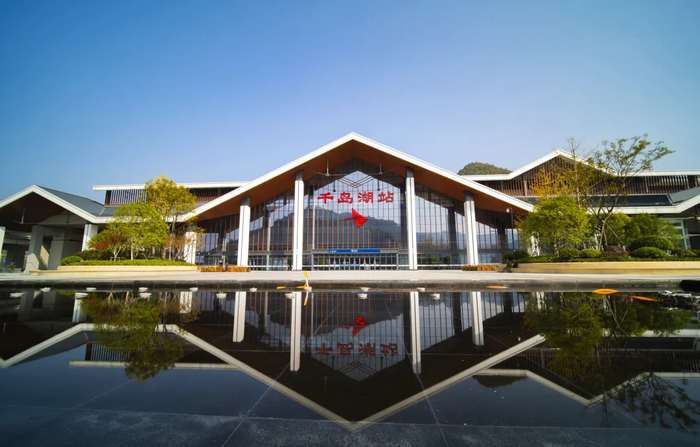 从杭州前往千岛湖,乘坐高铁不到1个小时。千岛湖站是杭黄高铁上的车站,是一个建在“山边、湖边、溪边、桥边”的车站,站房独具江南水乡特色。