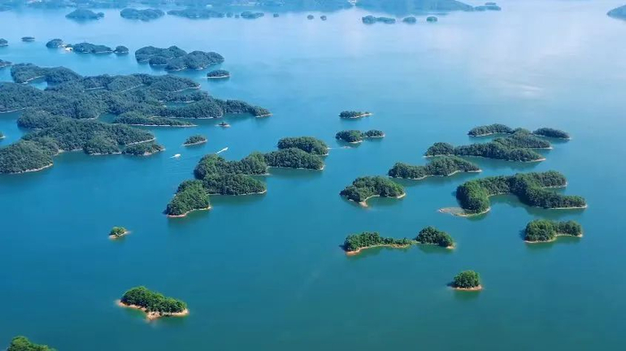 千岛湖有上千座岛屿,碧波万顷、翠绿欲滴,被称为“天下第一秀水”。