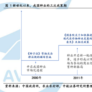 中航证券的行业研报分析,第一阶段政策期以2000年《种子法》颁布为起点,标志中国种业市场化正式启程。第二阶段以国务院八号文件开启改革时期为标志,中国正式步入市场导向的商业化育种时期。第三阶段从2020年开始,中央经济工作会议开启打好种业翻身仗的政策新周期。