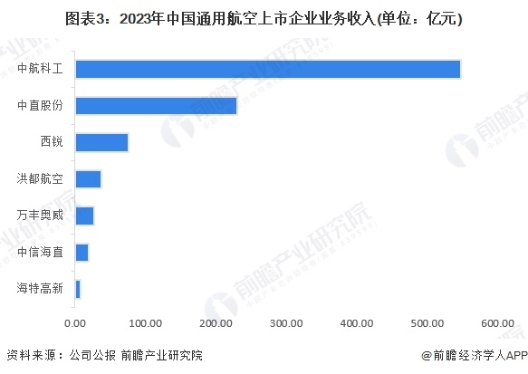 按通用航空相关业务收入来看,2023年,中航科工以547.92亿元的业务收入位列第一;中直股份业务收入约230.82亿元,位列行业第二;西锐飞机业务收入约75.83亿元。