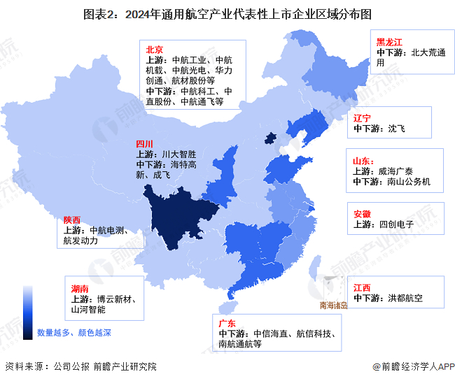 从代表性企业分布来看,通用航空产业代表性企业主要分布在北京以及四川、陕西等中部地区。同时,其余省市如黑龙江、辽宁、广东、安徽等也均有产业链企业分布。