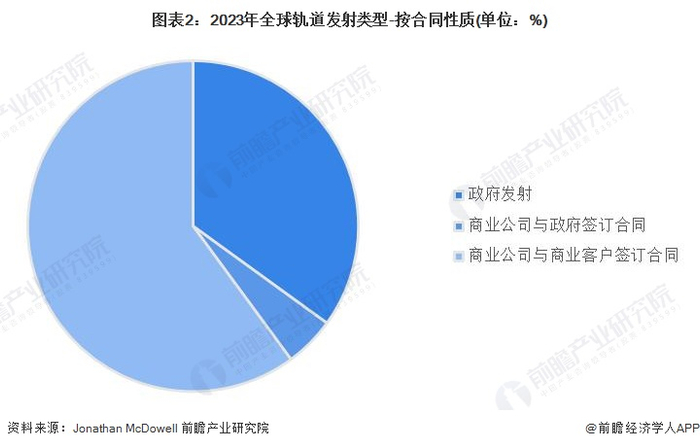 从合同类型来看,全球轨道发射市场中,商业公司与商业客户签订的合同发射占据了主导地位,据美国天文学家兼太空轨道分析师乔纳森·麦克道尔(Jonathan McDowell),2023年全球轨道发射中,有60%的合同为商业公司与商业客户签订合同发射。