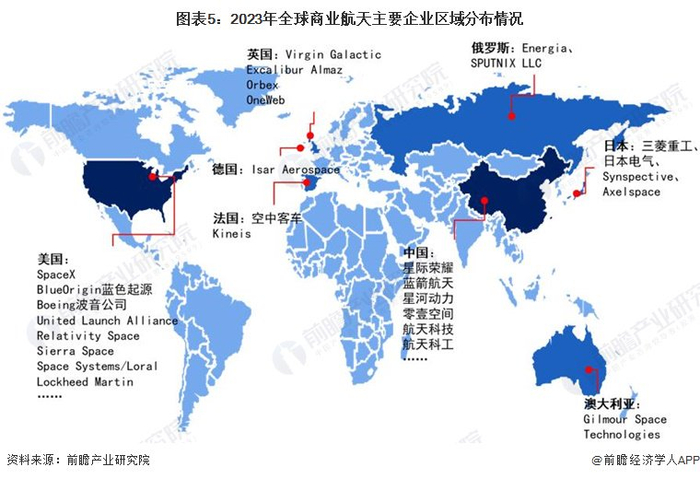 从全球商业航天企业区域分布情况来看,头部企业主要分布在美国和中国,产业链各环节布局完善,企业竞争力强,为全球商业航天主要发展活力,如SpaceX、中国航天科技集团等。全球商业航天主要企业区域分布具体如下:
