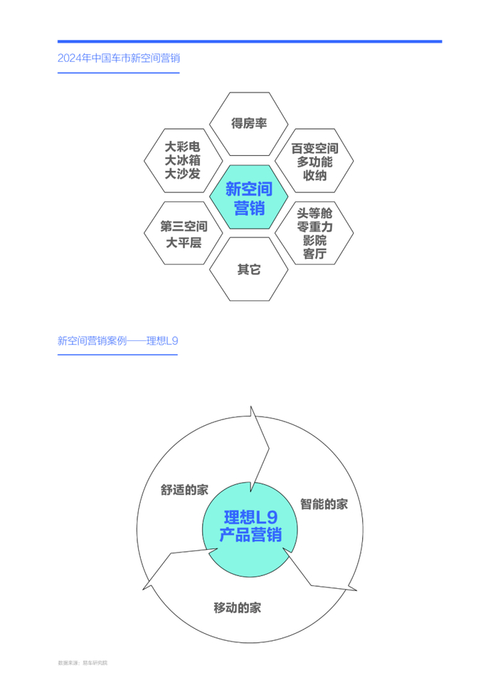 近几年,随着电气化、智能化等新技术的快速普及,以中国品牌为主的车企,挖掘与包装出了更多空间卖点,目前大家耳熟能详的“大彩电/大冰箱/大沙发、得房率、大平层”等新营销概念,本质上都在努力丰富和拓展空间卖点的内涵与外延。