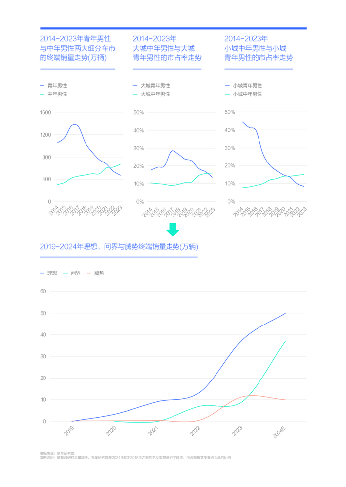 通过对大叔用户的细分,发现越优质的大叔用户的空间诉求越强烈,越有利于车企优化用户结构。其实积极迎合大叔的空间诉求,也有利于车企提升市场销量。近十年,大叔车市的终端销量持续增长,2014年仅300万辆多点,2023年逼近700万辆,并于2022年超越男性青年,一跃成为中国的新第一车市,而且小城大叔与大城大叔“比翼双飞”。男性青年的终端销量由2016年近1400万辆,跌至2023年不足500万辆,对重点满足男性青年的空间诉求的车企,形成了沉重打击;