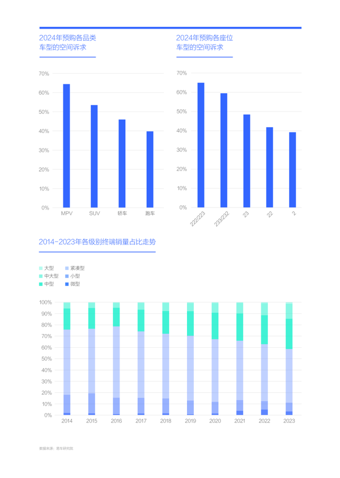 基于中年化、电气化、智能化等新趋势,有些产品率先受益:从品类看,2024年,预购MPV、SUV的用户空间诉求分别高达64.43%、53.48%,大幅领先于轿车与跑车;从座位布局看,2024年,预购222/223、233/232等多座位车型的用户空间诉求分别高达64.91%、59.46%,大幅领先于23布局的车型;